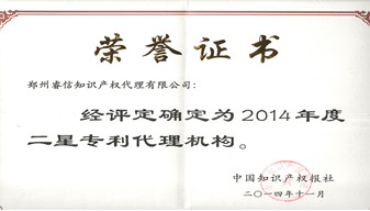 2014年11月公司被評(píng)為“2014年度二星專利代理機(jī)構(gòu)”。 -