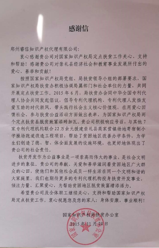 今年,協(xié)會(huì)首次開展了行業(yè)扶貧公益活動(dòng),在承接的2個(gè)扶貧項(xiàng)目中,得到了多家專利代理機(jī)構(gòu)的積極響應(yīng)和支持。最終由北京柳沈律師事務(wù)所、中國國際貿(mào)易促進(jìn)委員會(huì)專利商標(biāo)事務(wù)所、鄭州睿信知識(shí)產(chǎn)權(quán)代理有限公司、北京三友知識(shí)產(chǎn)權(quán)有限公司、廣州華進(jìn)聯(lián)合專利商標(biāo)代理有限公司等9家代理機(jī)構(gòu)出資捐助完成。