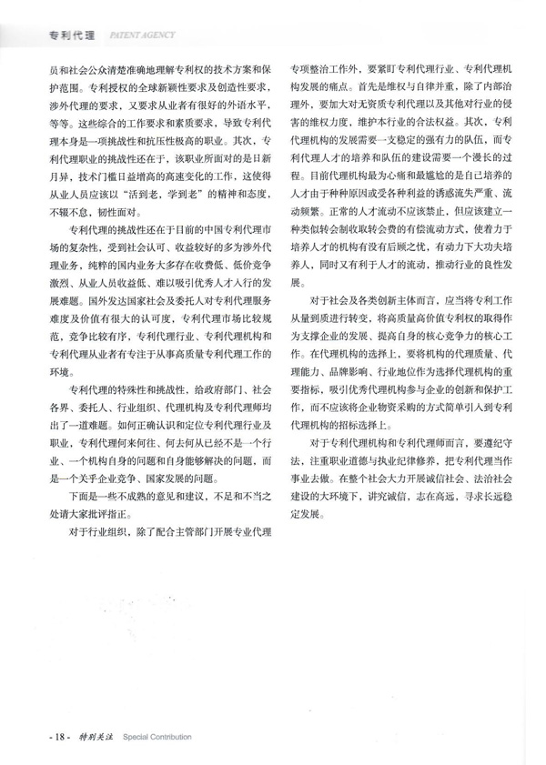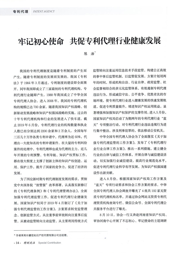 陳浩——鄭州睿信知識產(chǎn)權(quán)代理有限公司總經(jīng)理,是中華全國專利代理人協(xié)會第九屆副會長,現(xiàn)任中華全國專利代理人協(xié)會第十屆副會長。陳總是全國知識產(chǎn)權(quán)行業(yè)領軍人才,國家知識產(chǎn)權(quán)專家?guī)鞂<?,全國五星級專利代理人,工業(yè)和信息化領域知識產(chǎn)權(quán)專家,從事專利代理24年,見證了代理行業(yè)的發(fā)展和變遷。陳總用獨特的視角,通過對不同時期我國專利代理制度的介紹,談專利代理行業(yè)的初心和使命。專利代理行業(yè)的特殊性在于其社會責任性,專利代理之于創(chuàng)新主體、之于政府和管理部門都有著重要的作用。如何正確認識和定位專利代理行業(yè)及職業(yè),專利代理何去何從已經(jīng)不是一個行業(yè)、一個機構(gòu)自身的問題和自身能夠解決的問題,而是一個關(guān)乎企業(yè)競爭、國家發(fā)展的問題。陳總并就專利代理行業(yè)發(fā)展面臨的問題提出了頗有見地的解決辦法。